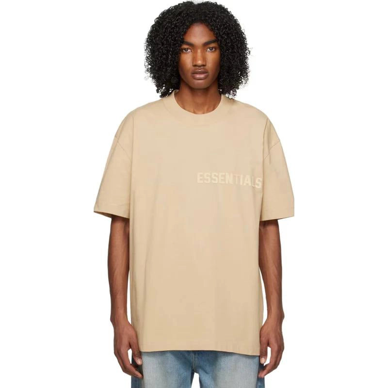 The Fear Of God Essentials 'Sand' T-Shirt features a soft cotton build with a neutral tone that fits any wardrobe. Designed with a relaxed silhouette and subtle branding, it's perfect for layering or solo wear. Comfortable, minimal, and stylish—this tee is a must-have for modern streetwear enthusiasts.